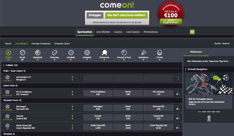 Grundvoraussetzung für den Willkommensbonus ist natürlich ein Kundenkonto beim Buchmacher. Letzteres eröffnest Du einfach online. Das hierzu vorgesehen Webformular öffnet sich mit dem Klick auf „Jetzt Registrieren“. - Geld bei Come On einzahlen: